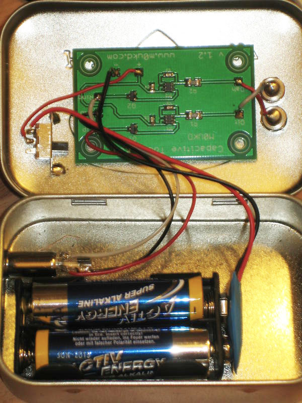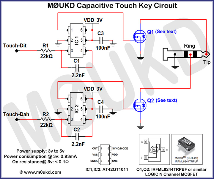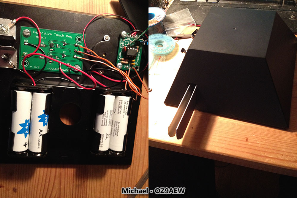 Following on from the simple CW touch keys in the previous page, this page shows a capacitive touch project which is the ideal touch sensitive key solution. The project described here is a iambic capacitive touch key which uses 2 AA size batteries for 3v power, draws <1mA current and has an 'on' switching resistance of <0.1Ω with a 3v supply.